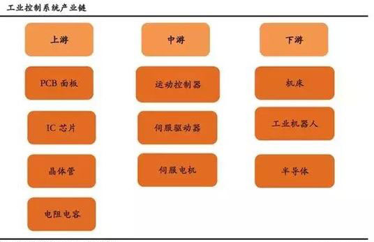 控制系統(tǒng)上游包括各類(lèi)電子元器件,如PCB面板、IC芯片、晶體管、電阻電容等,中游核心部件包含運(yùn)動(dòng)控制器、伺服驅(qū)動(dòng)器、伺服電機(jī)等,下游運(yùn)用于工業(yè)機(jī)器人、半導(dǎo)體、機(jī)床等各行各業(yè)。