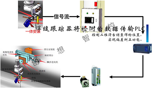 焊縫跟蹤器將檢測(cè)的數(shù)據(jù)傳輸PLC,控制二維滑臺(tái)調(diào)整焊槍位置,實(shí)現(xiàn)偏差糾正功能。