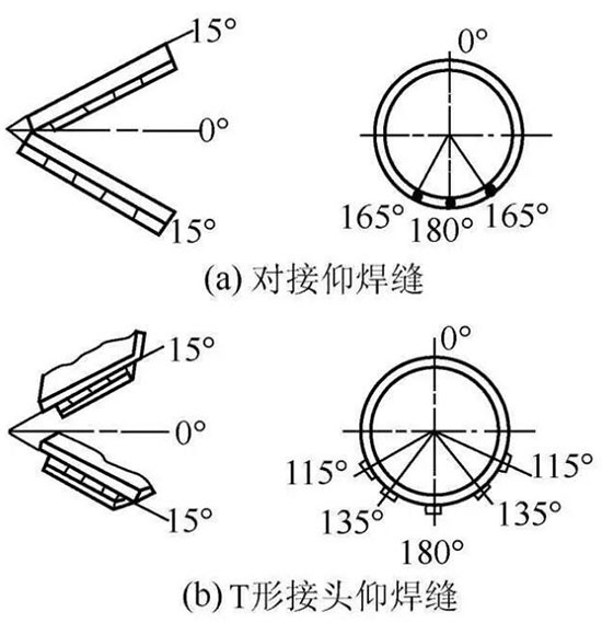 有兩種情況,一種是焊縫傾角在0°~15°,焊接轉(zhuǎn)角165°~180°的對接焊縫;另一種是角焊縫的焊縫傾角在0°~15°,焊縫轉(zhuǎn)角115°~180°的仰焊位置施焊的焊縫。