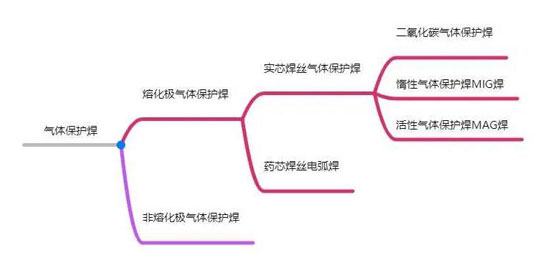 氣體保護(hù)焊根據(jù)所采用的保護(hù)氣體的種類不同,適于焊接不同的金屬。氣體保護(hù)焊的分類方法很多,通常分類如下圖: