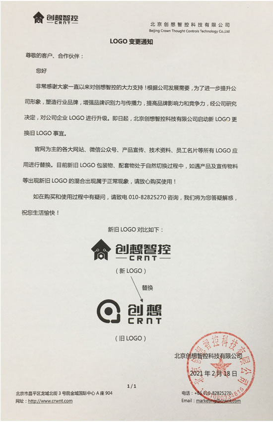 非常感謝大家一直以來對(duì)創(chuàng)想智控的大力支持!根據(jù)公司發(fā)展需要,為了進(jìn)一步提升公司形象,塑造行業(yè)品牌,增強(qiáng)品牌識(shí)別力與傳播力,提高品牌影響力和競爭力,經(jīng)公司研究決定,對(duì)公司企業(yè)LOGO進(jìn)行升級(jí)。即日起,北京創(chuàng)想智控科技有限公司啟動(dòng)新LOGO更換舊LOGO事宜。