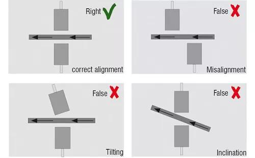 傳感器對準(zhǔn)必須特別注意安裝在對方對面的兩個傳感器的對準(zhǔn),不允許傳感器相對于目標(biāo)物體不對齊、傾斜。例如,當(dāng)偏差為1mm,傾斜度為2°時,厚度測量誤差為35m。在目標(biāo)厚度為10 mm的情況下,這一誤差增加到41μm。